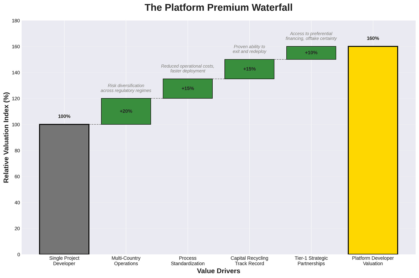 The Platform Premium is where things get spicy. A 40-60% premium sounds insane until you realize what a true platform provides: standardized contracts that banks actually understand, relationships that survive election cycles, and the ability to tell a panel supplier "I need 500MW next year" without them laughing.