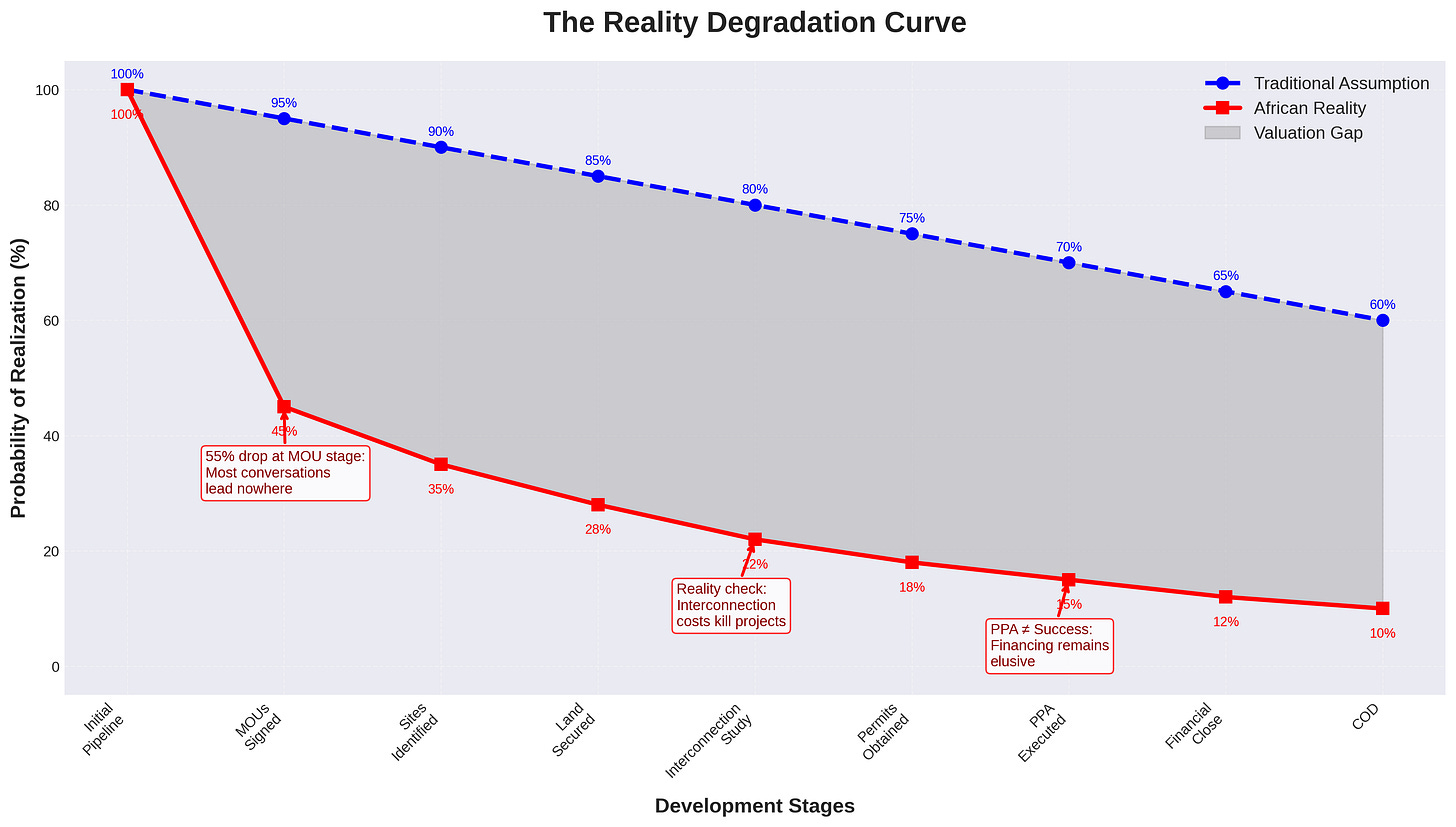 4. The Execution Track Record Coefficient In mature markets, pipeline value degrades linearly with development stage. In Africa, it's binary. Either you have: