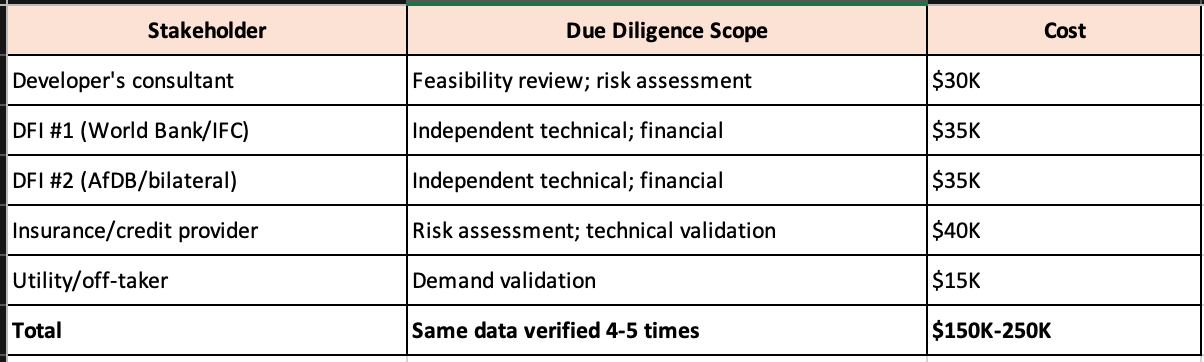 Here’s how it works. A typical African energy project seeking financing involves multiple stakeholders: the developer, one or more DFIs (World Bank, AfDB), bilateral partners, insurance providers, the utility/off-taker. Each of these stakeholders independently verifies the same technical and financial data using different consultants and different methodologies.